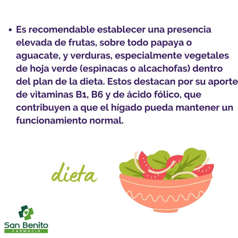 Dieta Es recomendable establecer una presencia elevada de frutas, sobre todo papaya o aguacate, y verduras, especialmente vegetales de hoja verde (espinacas o alcachofas) dentro del plan de la dieta. Estos destacan por su aporte de vitaminas B1, B6 y de ácido fólico, que contribuyen a que el hígado pueda mantener un funcionamiento normal.