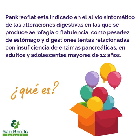 Os traemos el producto ideal si sufrís de gases. No dejes que esto te arruine el día y empieza a usar Pankreoflat. Leed los consejos que encontraréis en la imágenes que hemos preparado. Si aún así tenéis alguna duda podéis visitarnos en la Farmacia San Benito y os informaremos en persona.