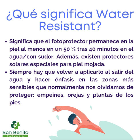 ¿Qué significa Water Resistant? Significa que el fotoprotector permanece en la piel al menos en un 50 % tras 40 minutos en el agua/con sudor. Además, existen protectores solares especiales para piel mojada. Siempre hay que volver a aplicarlo al salir del agua y hacer énfasis en las zonas más sensibles que normalmente nos olvidamos de proteger: empeines, orejas y plantas de los pies.