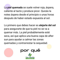 🌞La piel quemada se suele volver roja, áspera, caliente al tacto y produce picor. Quizás la notes áspera desde el principio o unas horas después de haber estado expuesta al sol.